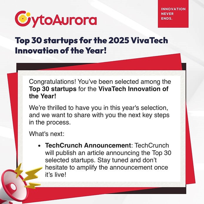 เรารู้สึกเป็นเกียรติอย่างยิ่งที่ได้รับการคัดเลือกให้เป็นหนึ่งใน 30 สตาร์ทอัพนวัตกรรมระดับโลก ประจำปี 2025 ในหมวด VivaTech Innovation of the Year!